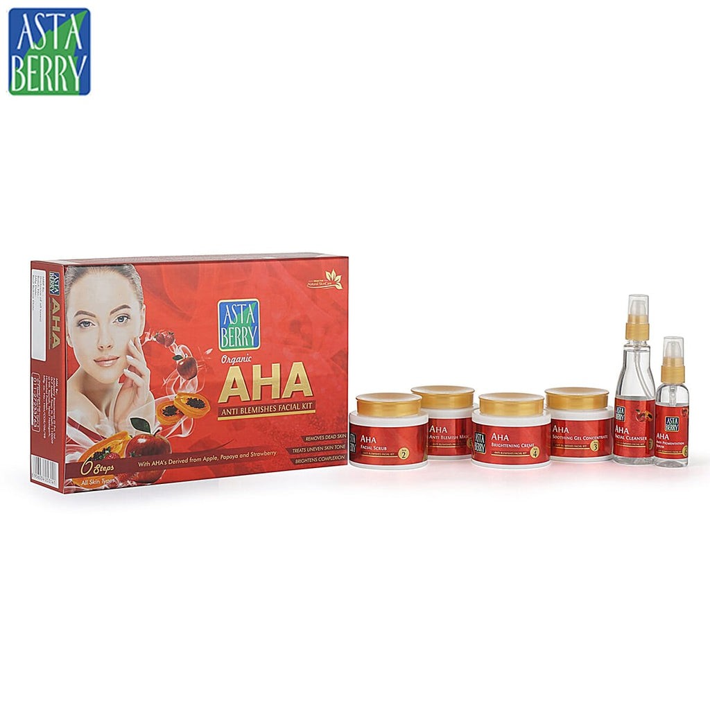 - Astaberry AHA Facial improves action of the capillaries, skin texture and tighten pores– inducing relaxation and calming the mind. AHA facial is very good for very sensitive skin, which cannot tolerate any chemically prepared cosmetics. AHA acids, which are derived from fruits and flowers, are known for their anti-aging effects. The Astaberry Organic AHA facial Kit is formulated with AHAs derived from Apple, Strawberry & Papaya extracts, which help the skin look smoother and healthier. They are also recommended for people who have pigmented skin, and are prone to wrinkling easily.