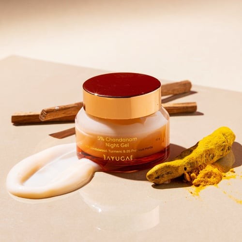 Softens & Makes Skin Plump An Ayurvedic blend of Sandalwood, Turmeric and 26 herbs, the Night Gel soothes the skin to make it smooth and plump, imparting it a youthful glow.