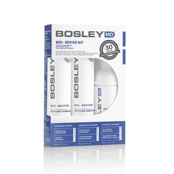 The BosRevive 30-Day Kit for Non-Color Treated Hair features a simple, 3-step system that includes a Nourishing Shampoo, Volumizing Conditioner, and Leave-In Thickening Treatment to help restore visibly thinning hair.