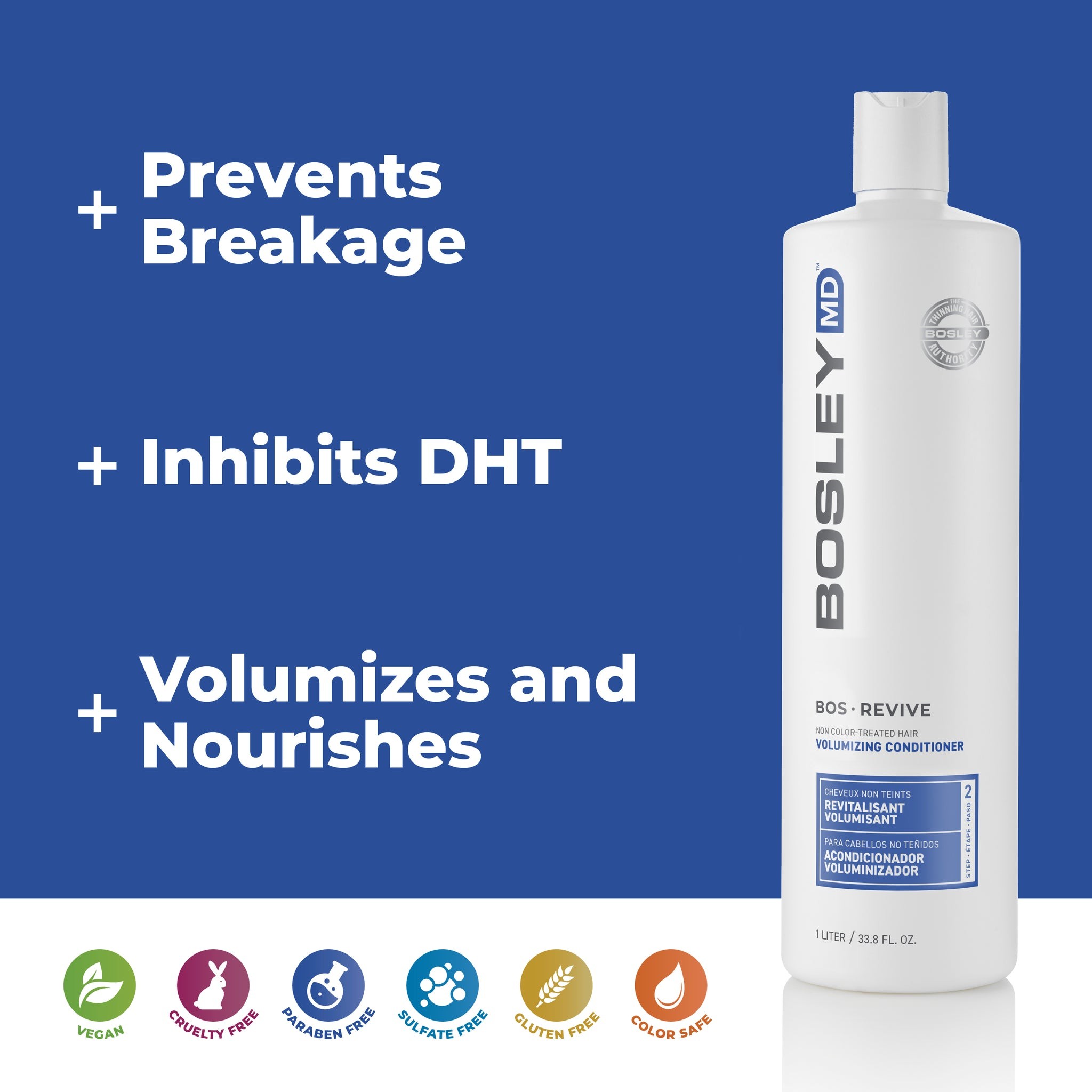 BosRevive Volumizing Conditioner is specially designed for people with visibly thinning hair. Weightless daily conditioner with DHT inhibitors adds body and shine without weighing down the hair. Saw Palmetto, a natural DHT blocker, works with Niacin to revitalize hair and reduce shedding, while Biotin and Panthenol strengthen hair strands. Hair appears fuller, nourished, and volumized.
