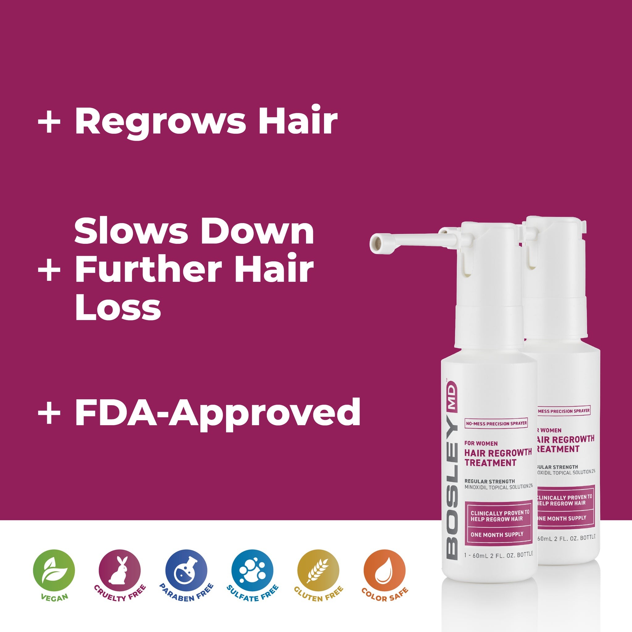 Hair Regrowth Treatment with Minoxidil formulated exclusively for Women is a leave-in, FDA-approved treatment available in a no-mess sprayer application that has been clinically proven to regrow hair and slow further hair loss. With this clinically proven formula, reactivate hair follicles to stimulate hair growth and combat hair loss for thicker, fuller-looking hair. A 60-day supply is available.