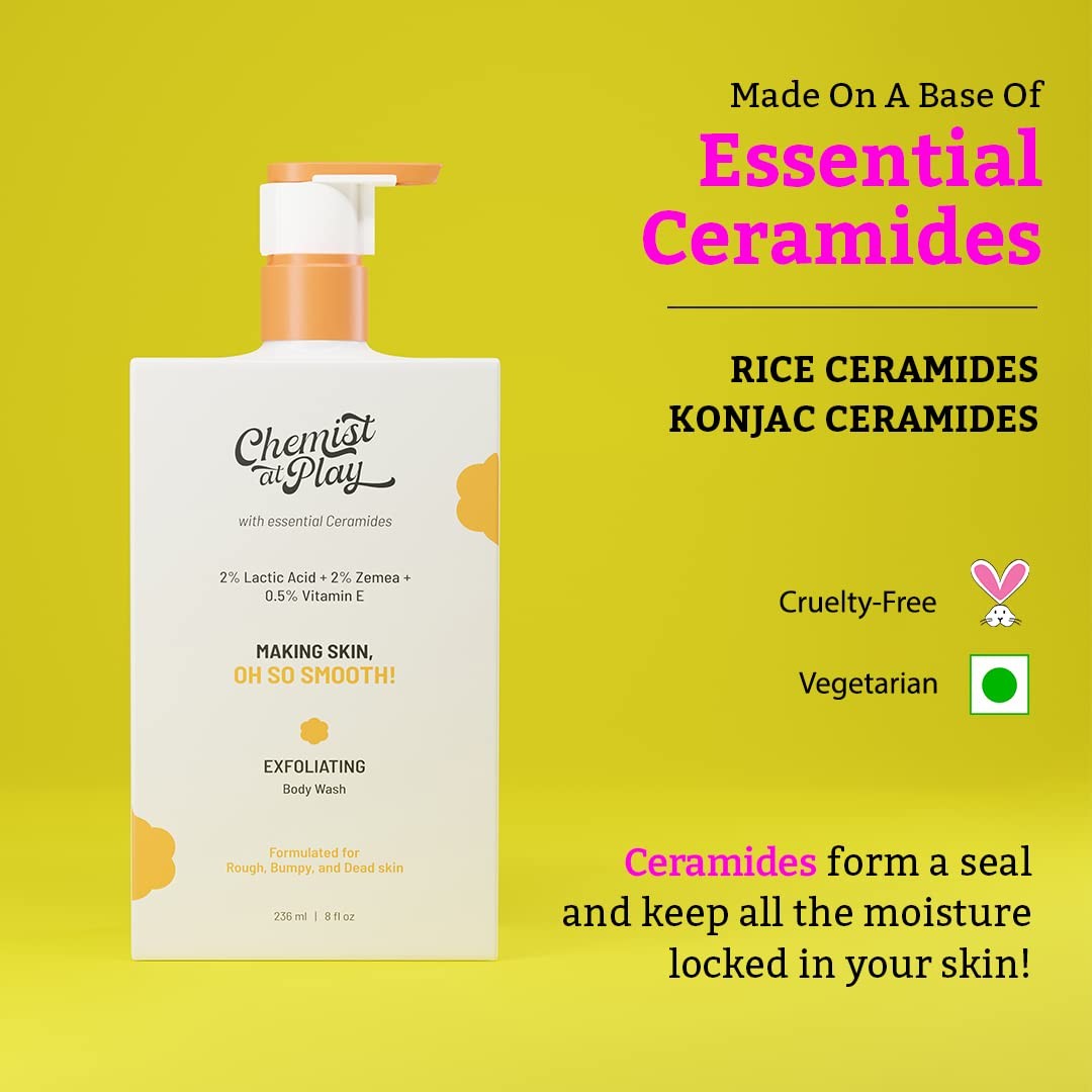 - Our Exfoliating Body Wash is enriched with 2% Lactic Acid + 2% Zemea + 0.5% Vitamin E that gently exfoliates dead skin cells, while keeping the skin mosturized.
