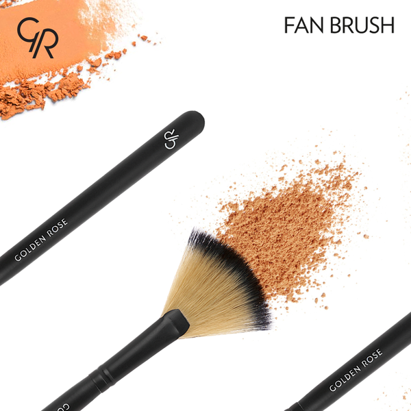 Flat fan-shaped brush for featherweight application of bronzing powder or highlighter and for removal of excess products after make-up.
