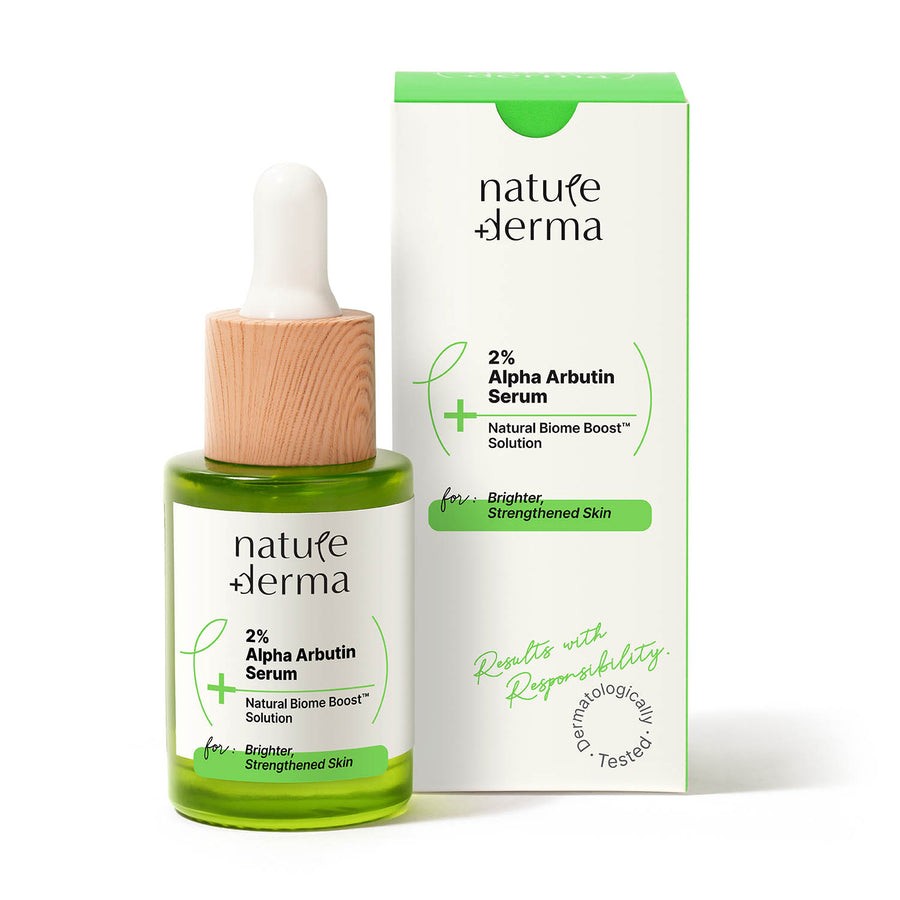 Product Description: 2% Alpha Arbutin Serum - 30 ml Nature Derma 2% Alpha Arbutin Serum is lightweight and non-greasy, designed to address issues of dark spots, uneven skin tone and hyperpigmentation. Alpha Arbutin helps reduce the formation of dark spots Pear extract is known to exfoliate dead skin cells, retain skin moisture, reduce oil production, and protect against cellular damage. Natural Biome-BoostTM Solution helps strengthen the skin barrier, improving moisture levels and soothing reactive skin. Weight: 30ml Directions To Use: Step1: Apply to the face in the morning Step2: Take 2 - 3 drops or as required. Gently apply on the face and neck Step3: Use sunscreen during the day while using the product Key Benefits: Reduces Dark Spots, Pigmentation Key Ingredients: