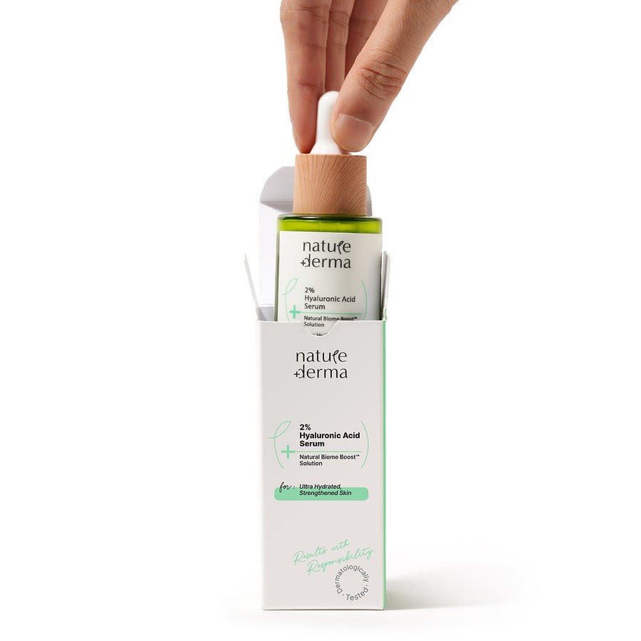 Product Description: 2% Hyaluronic Acid Serum - 30 ml Nature Derma 2% Hyaluronic Acid Serum is lightweight and non-greasy,designed to address issues of Dull Skin, Fine Lines, wrinkles, Textural Irregularities,Uneven Skin Tone. Hyaluronic Acid aids hydration to multiple layers of the skin, helps reduce the appearance of wrinkles, and helps promote youthful skin. Spinach extract is known to hydrate and restore skin's natural glow while reducing the appearance of aging and sun damage. Natural Biome-BoostTM Solution helps strengthen the skin barrier, improving moisture levels and soothing reactive skin. Weight: 30ml Directions To Use: Step1: Apply to the face in the morning Step2: Take 2 - 3 drops or as required. Gently apply on the face and neck Step3: Use sunscreen during the day while using the product Key Benefits: Reduces Fine Lines & Wrinkles