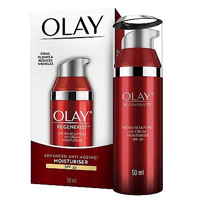 Olay regenerist advanced anti-ageing microsculpting cream moisturizer SPF 30 combines proven anti ageing technology and SPF protection with a revolutionary and surprisingly lightweight feel. Its proven regenerist technology works to reenergise skin-surface cells for a more youthful look, helping firm skin that has lost elasticity from skin damage.