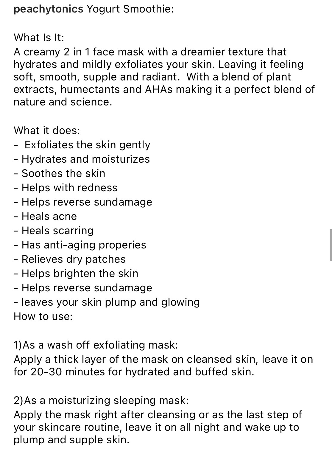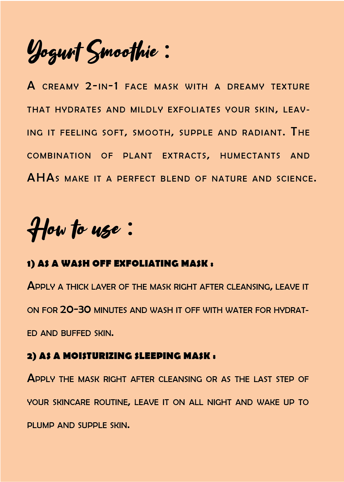 Our “Yogurt Smoothie” sleeping mask is one of our customers favorites because it’s so versatile and easy to use. Some use it as a night cream, some use it as a hydrating wash off mask and some use it as a sleeping mask few times a week.
