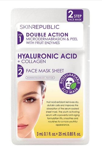 Cleanse skin. Tear open Step 1 sachet. Apply peel to face massaging gently for one minute, rinse off. Tear open Step 2 sachet. Remove mask, unfold and place onto face. Wear for 15-20 minutes. Remove mask, do not rinse. Excess serum can be applied to neck, décolletage and hands.