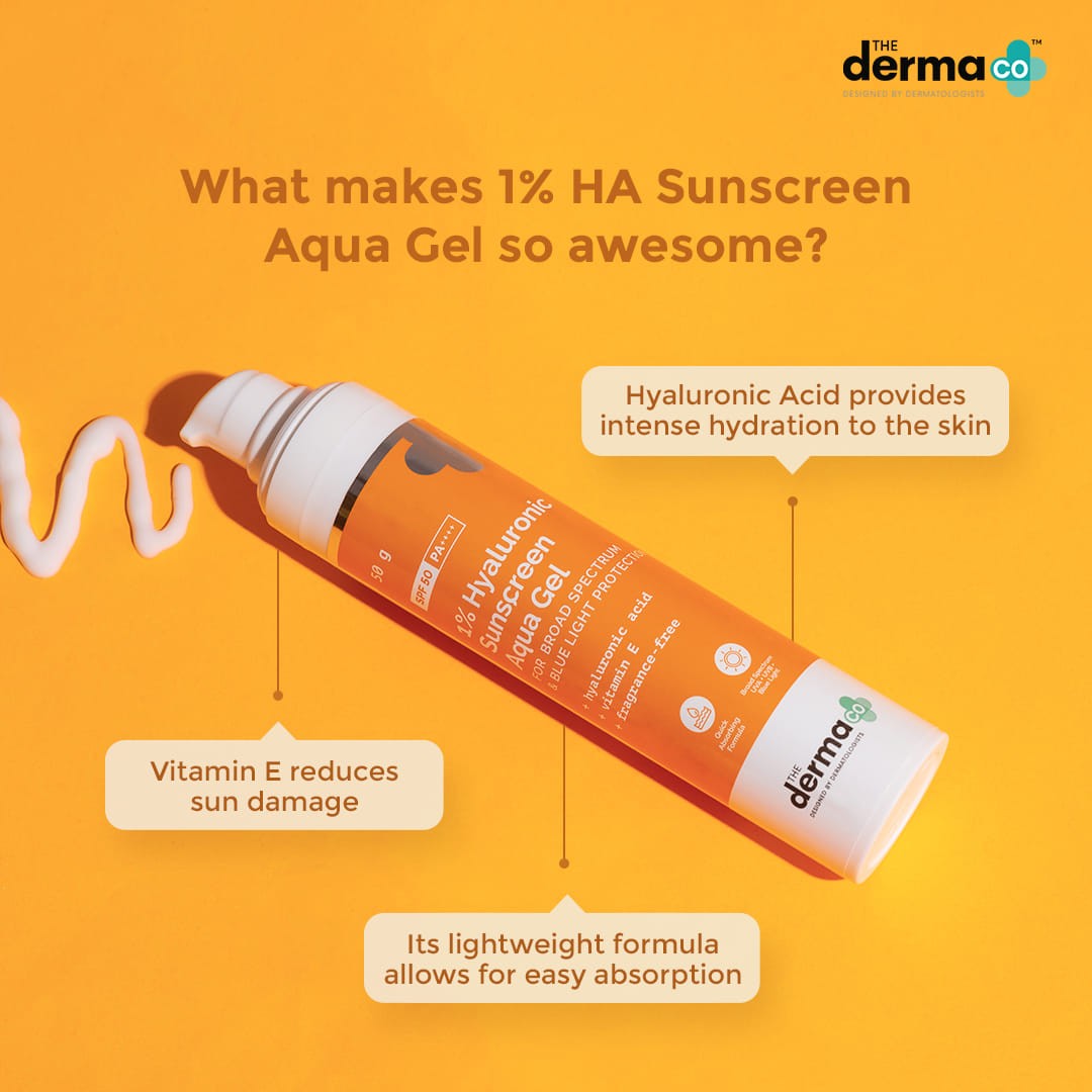 ideal sun protection with 1% Hyaluronic Sunscreen Aqua Gel that holds the power of SPF 50 & PA++++ formulation. What’s more? Guard your skin against blue light too without any greasy residual! It’s super lightweight, fragrance-free & dissolves like water. The effective combination of Hyaluronic Acid & Vitamin E helps fight sun damage, while also reducing fine lines