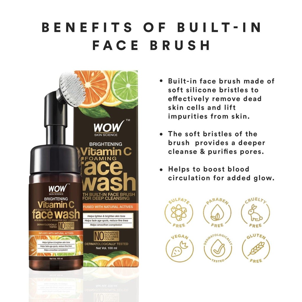 WOW Vitamin C Foaming Face Wash with Brush has powerful antioxidants to brighten your complexion. Gentle exfoliating action helps remove dead skin cells that dim your glow. Reveal the bright skin underneath and promote better skincare product absorption. An effective foaming face wash that clears away dirt, pollution, and makeup residue for hydrated, glowing skin!
