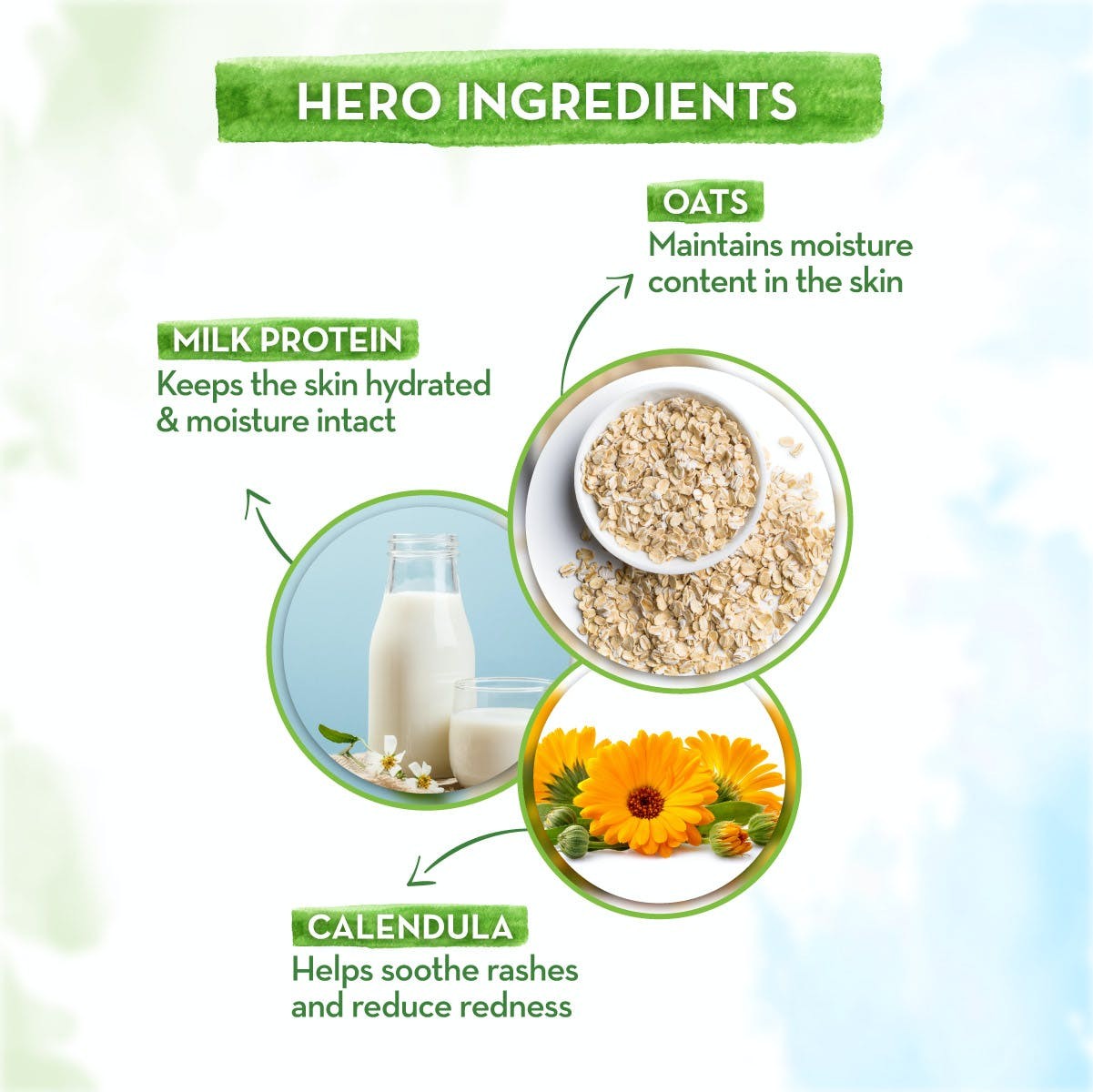 Enriched with the natural goodness of Oats, Milk and Calendula, I offer gentle and safe care to your munchkin by making their skin supple and soft. Oat Milk has immense moisturizing and soothing properties that help in getting rid of dry and itchy skin, while Calendula is rich in Vitamin E & amino acids, leaving skin deeply nourished.