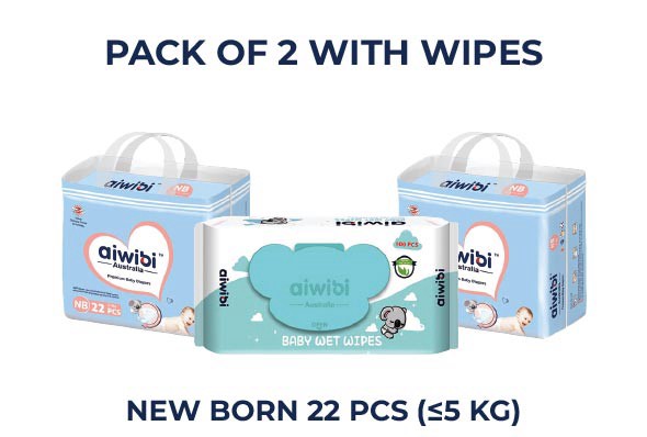 Aiwibi Australian Baby Diapers With Elastic Waistband NB22 Pack Of 2 With Wipes