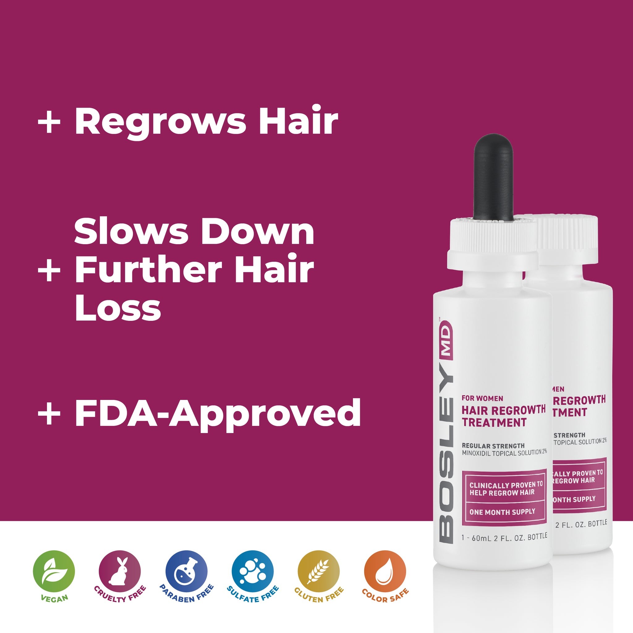 Hair Regrowth Treatment with Minoxidil Formulated Exclusively for Women is a leave-in, FDA-approved treatment available in dropper application that has been clinically proven to regrow hair and slow further hair loss. Reactivate hair follicles to stimulate hair growth and fight hair loss with this clinically proven formula and achieve thicker, fuller-looking hair. 60-day supply.