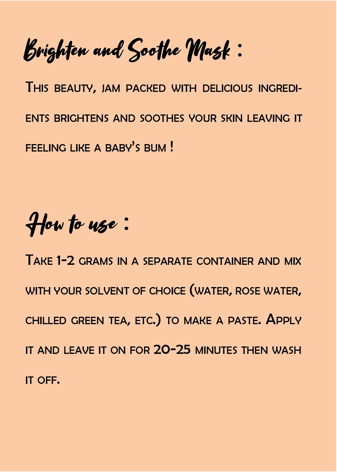 Take about 1-2 gram in a bowl and mix with your solvent of choice (water,rose water, hydrating toners, chilled green tea, yoghurt etc) leave it on for 15-20 minutes and wash it off.