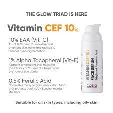 FEATURES: CEF features a synergistic antioxidant combination of 10% pure vitamin C (Ethylated ascorbic acid), 1% vitamin E (alpha-tocopherol), and 0.5% ferulic acid to enhance protection against environmental damage caused by free radicals that can contribute to atmospheric aging. CEF is now proven to reduce combined oxidative damage generated by UVA/UVB rays, ozone pollution, and diesel engine exhaust by up to 41%. In addition to antioxidant protective benefits, CEF improves signs of aging and photodamage, the appearance of lines and wrinkles, and the loss of firmness, while brightening skin's complexion.