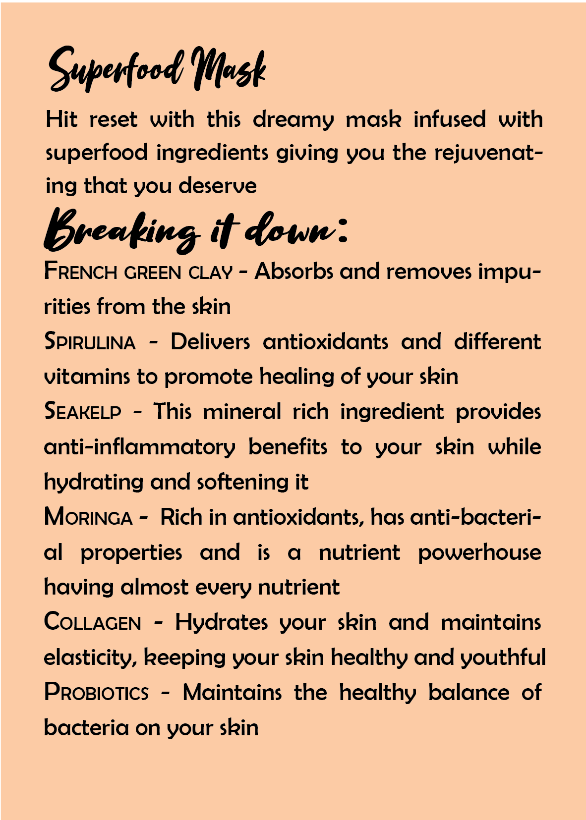 Mix this mask with chilled green tea to make it more clarifying or mix it with organic yoghurt to make it more hydrating. You can also mix a few drops of facial oil for a little moisturizing boost!